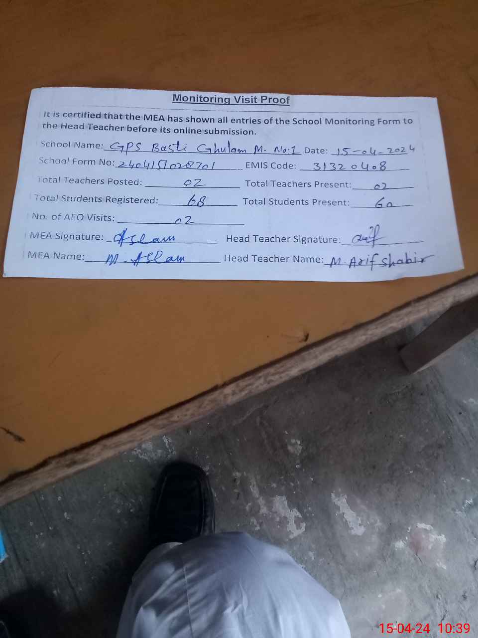 | Attendance Register | Head Teacher | MEA with School | Visit Proof |