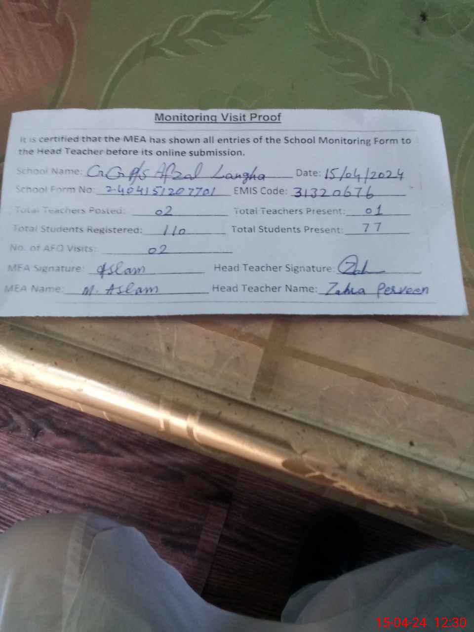 | EMIS Code: 31320676 | Name of School: GGPS AFZAL LANGA JHADY | |||