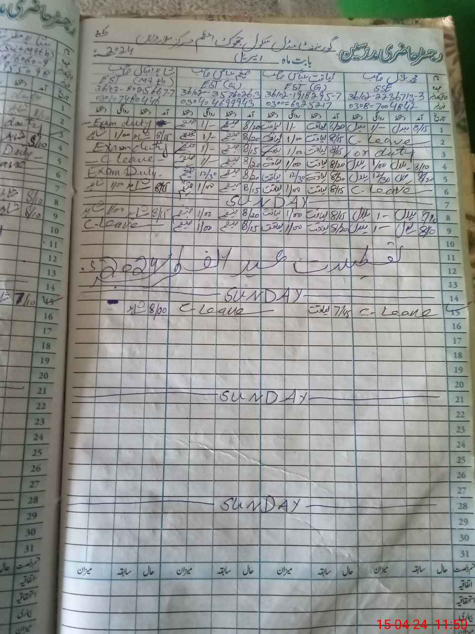 | CNIC | Full Name | Designation | R/C | Absence During Last Calender Month |