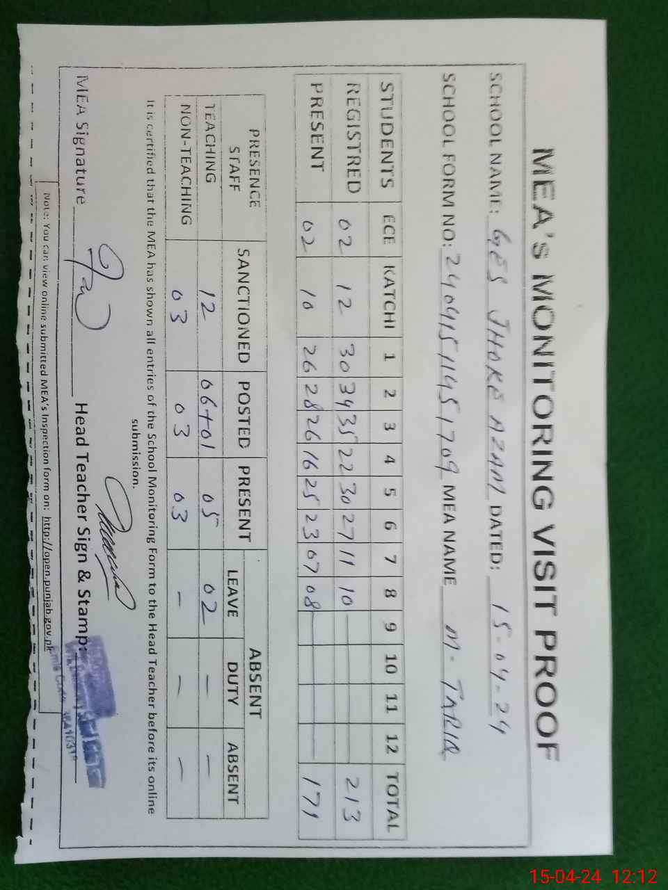 | Attendance Register | Head Teacher | MEA with School | Visit Proof |