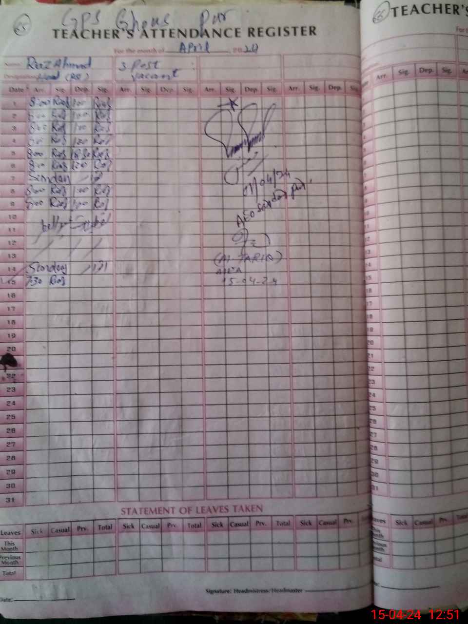 | Name: Ri**** Ah**** Designation: (School Headmaster's/Headmistress's) PST Phone/Cell Number: 03**** |