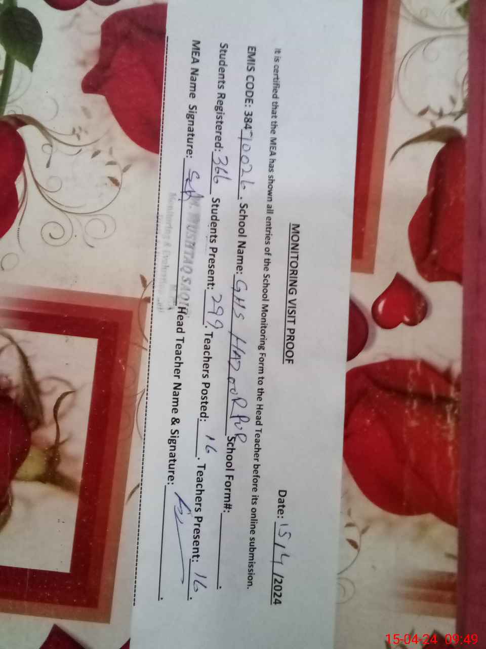 | Certified that this School was Inspected by the Undersigned MEA/DMO Today and the Information Stated Above is as Per Record. | |||||