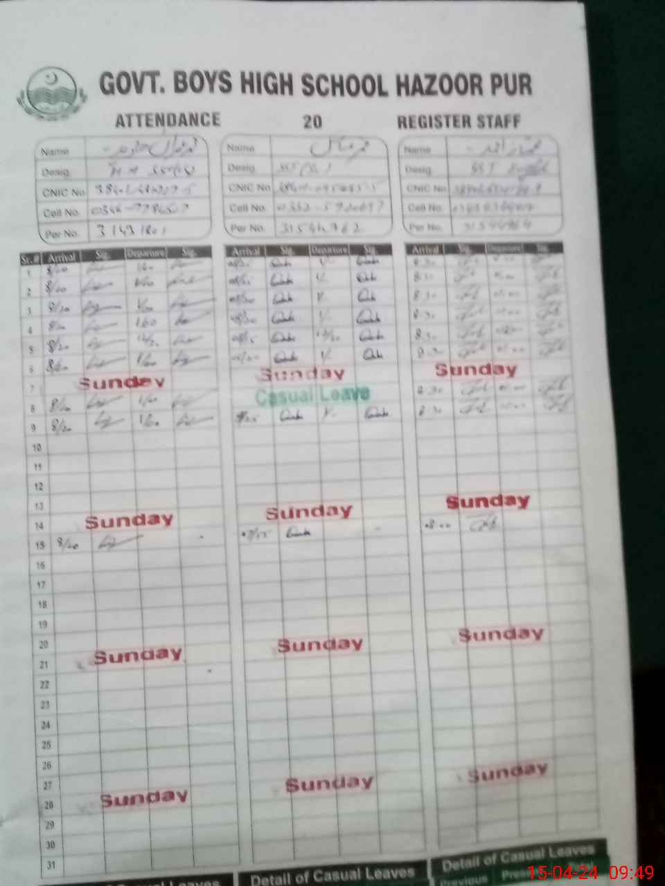 | CNIC | Full Name | Designation | R/C | Absence During Last Calender Month |
