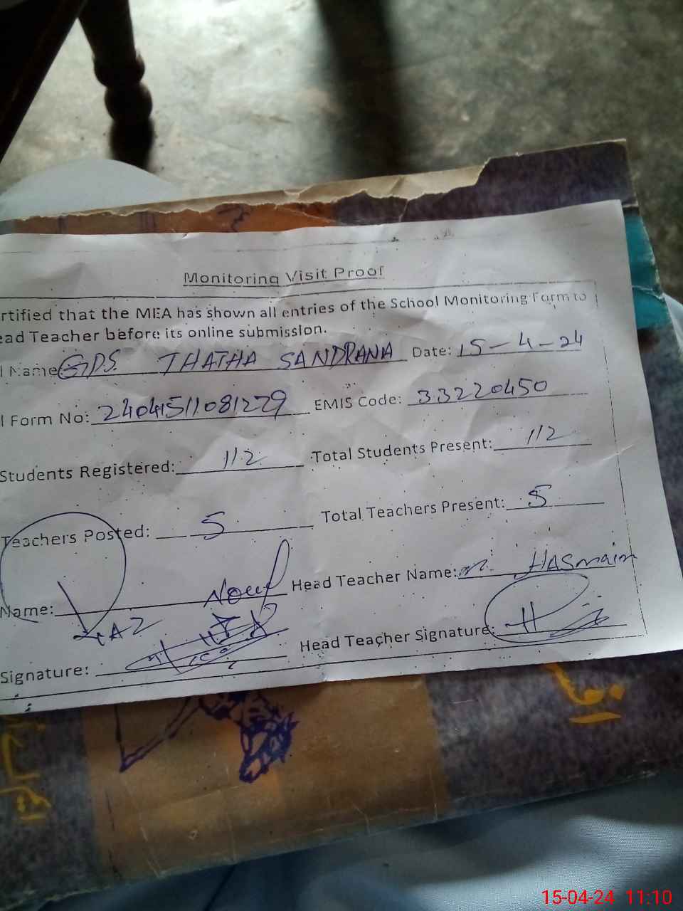 | Attendance Register | Head Teacher | MEA with School | Visit Proof |