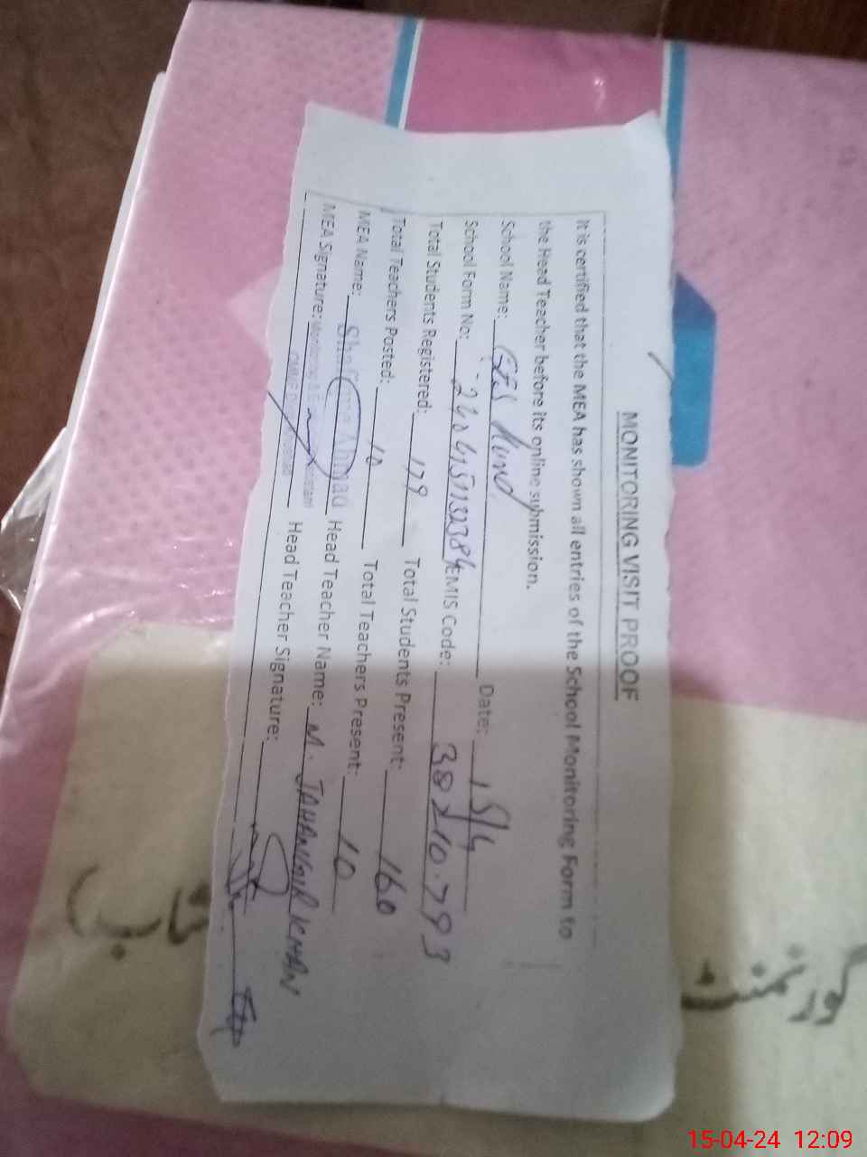| Attendance Register | Head Teacher | MEA with School | Visit Proof |