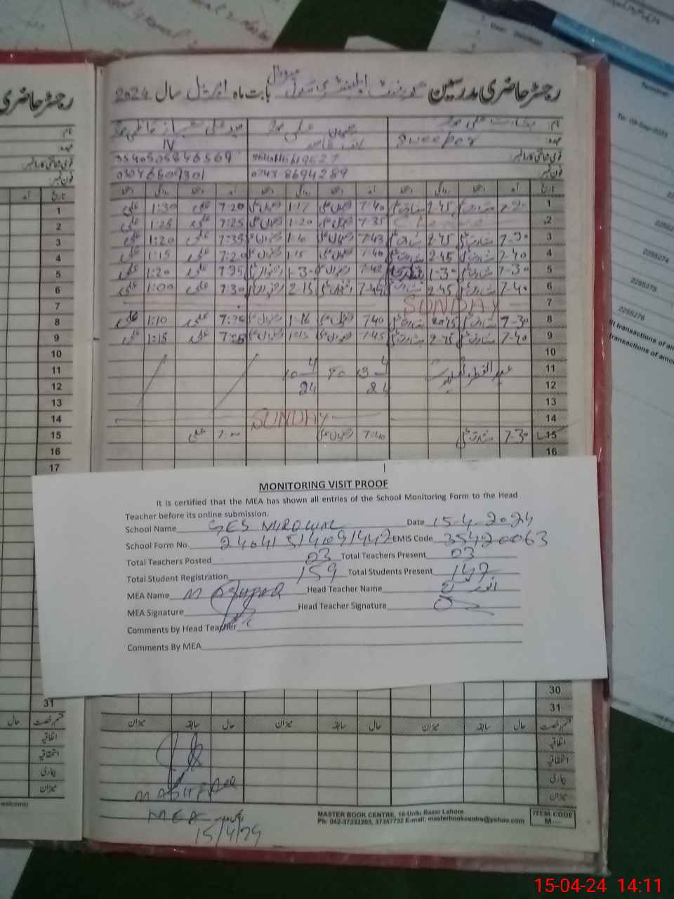| Attendance Register | Head Teacher | MEA with School | Visit Proof |