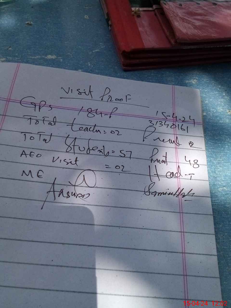 | Attendance Register | Head Teacher | MEA with School | Visit Proof |