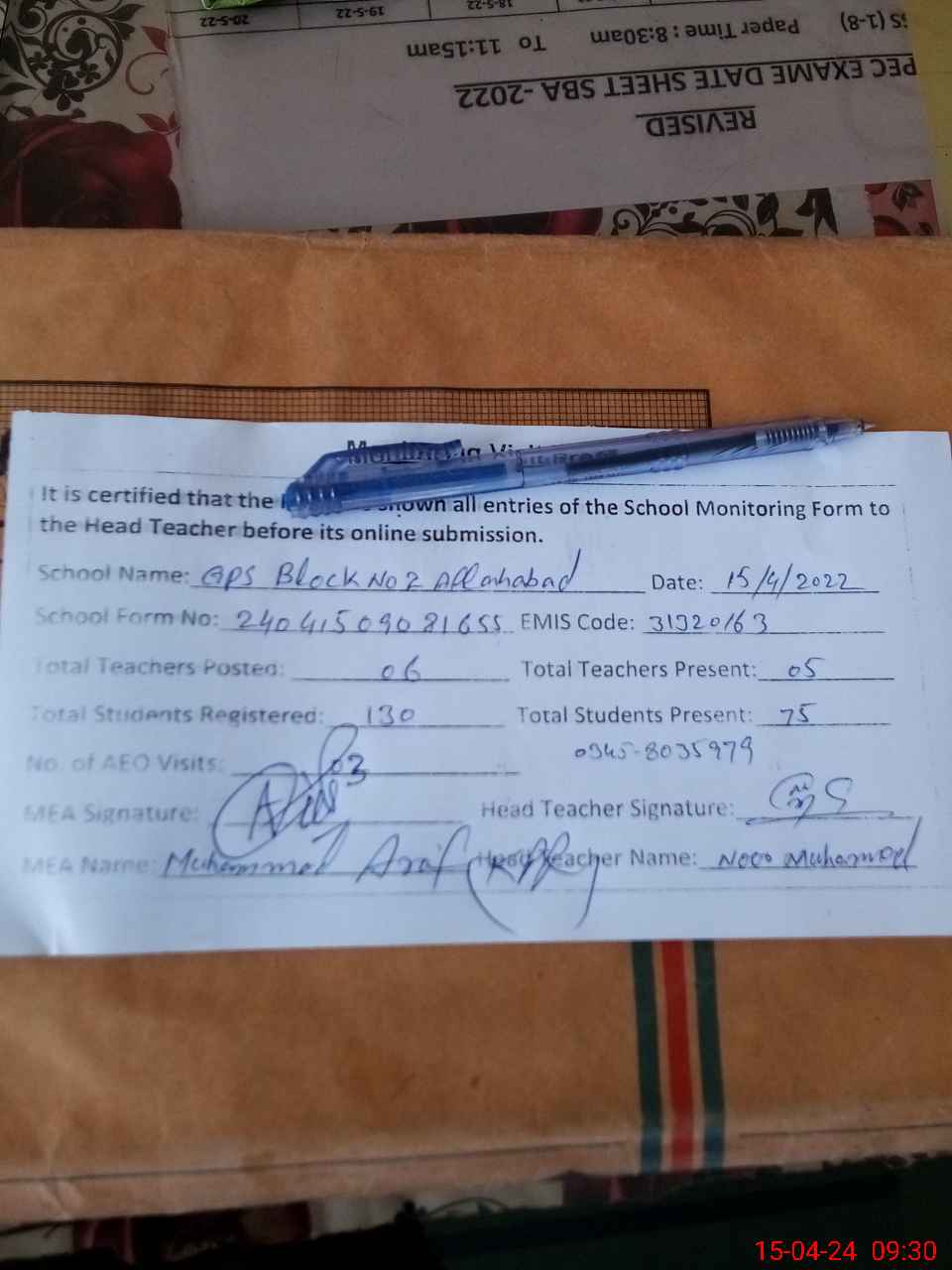| Name: No**** Mu**** Sh**** Designation: (School Headmaster's/Headmistress's) PST Phone/Cell Number: 03**** |