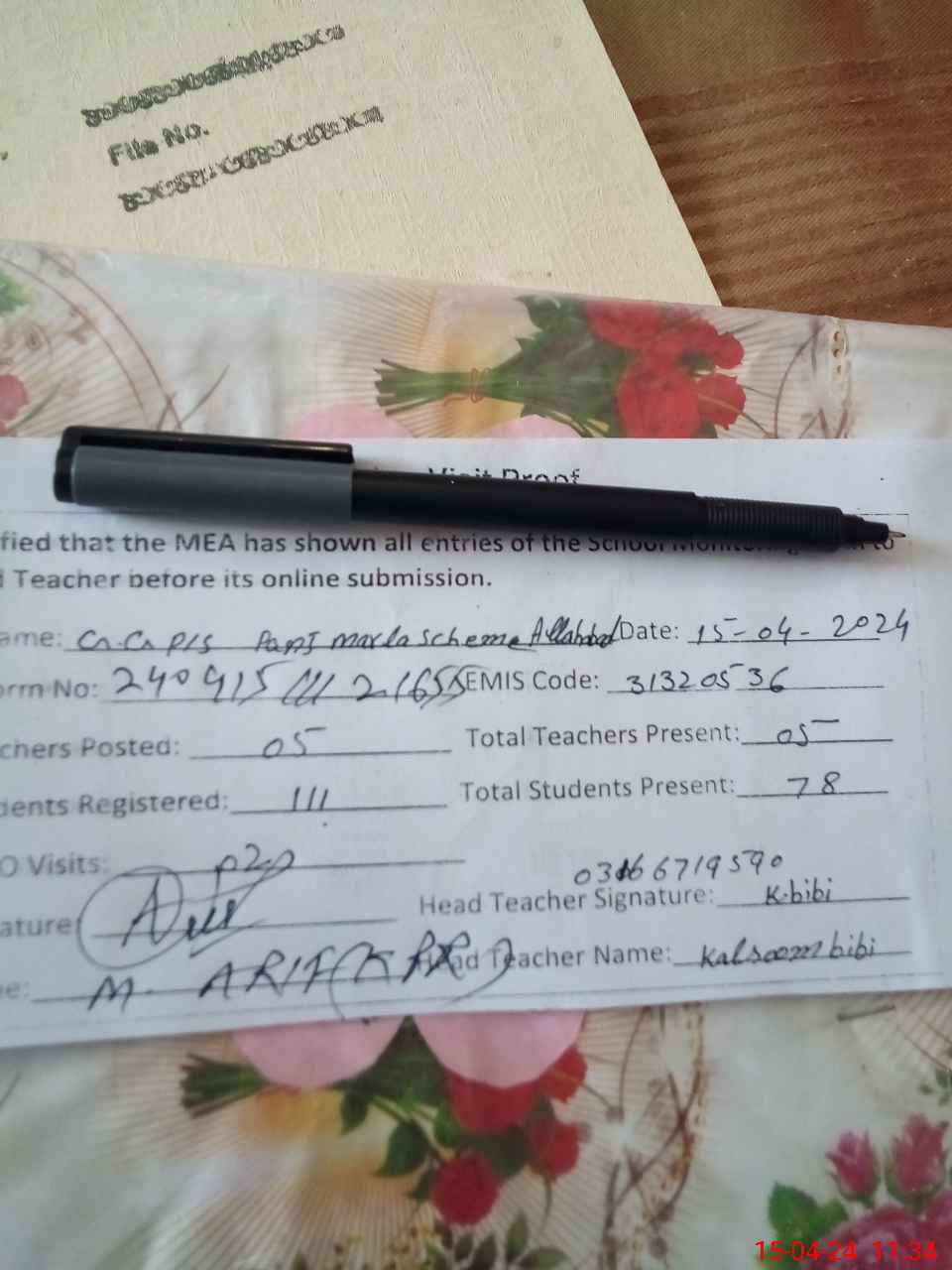 | Name: KA**** BI**** Designation: (School Headmaster's/Headmistress's) P S T Phone/Cell Number: 03**** |
