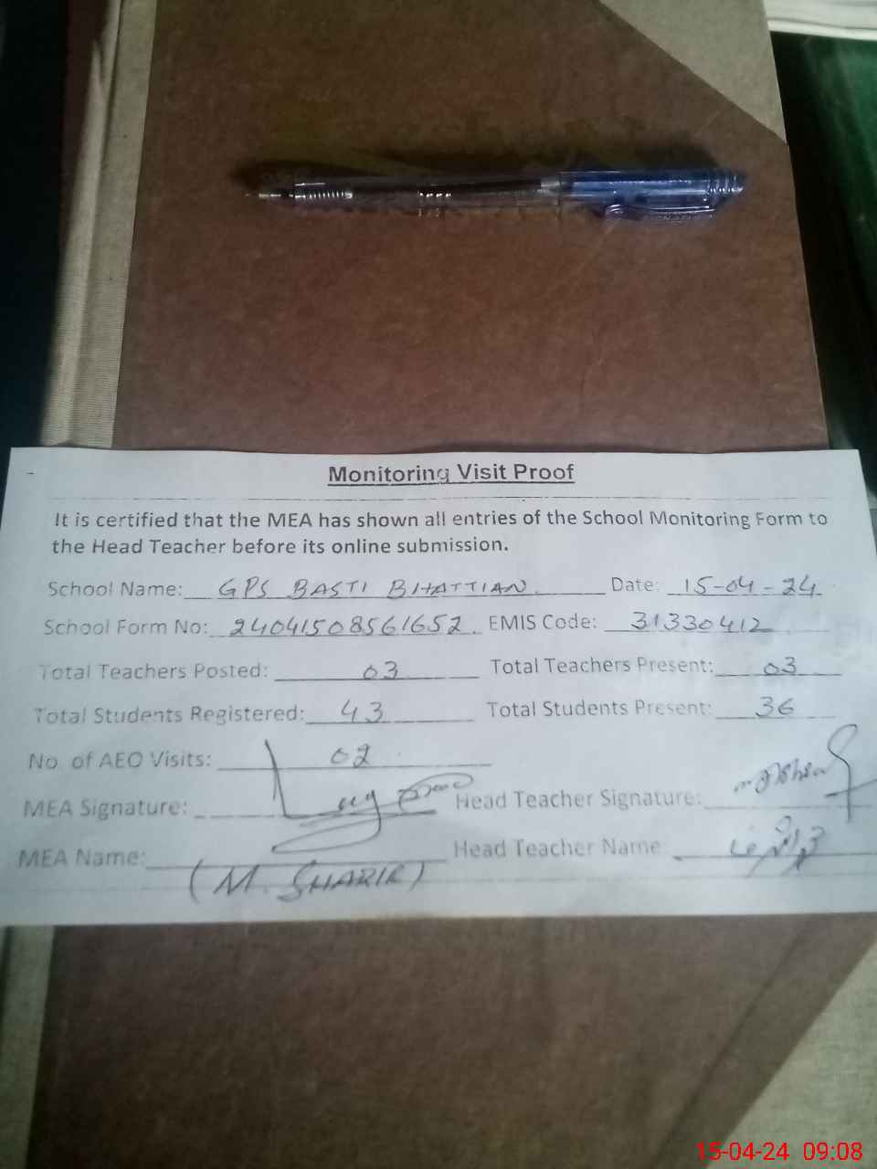 | Attendance Register | Head Teacher | MEA with School | Visit Proof |