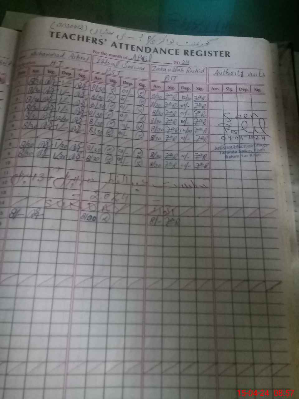| CNIC | Full Name | Designation | R/C | Absence During Last Calender Month |