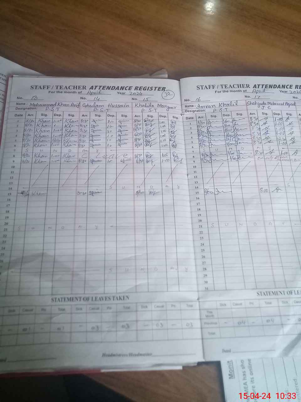 | CNIC | Full Name | Designation | R/C | Absence During Last Calender Month |