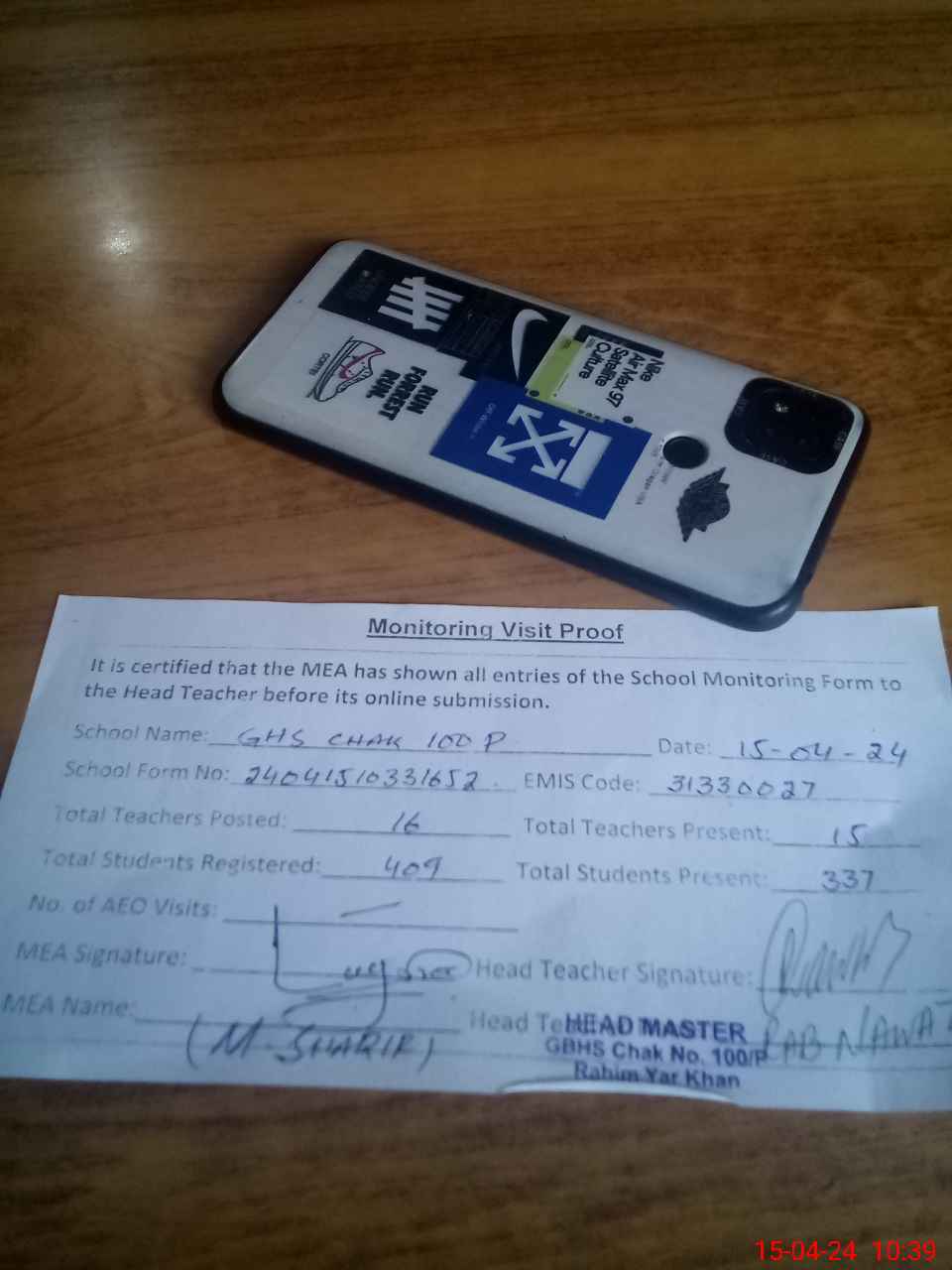 | Attendance Register | Head Teacher | MEA with School | Visit Proof |