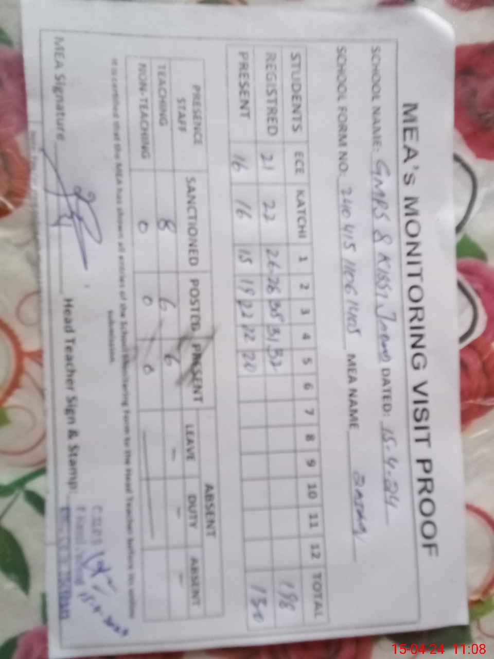 | Attendance Register | Head Teacher | MEA with School | Visit Proof |