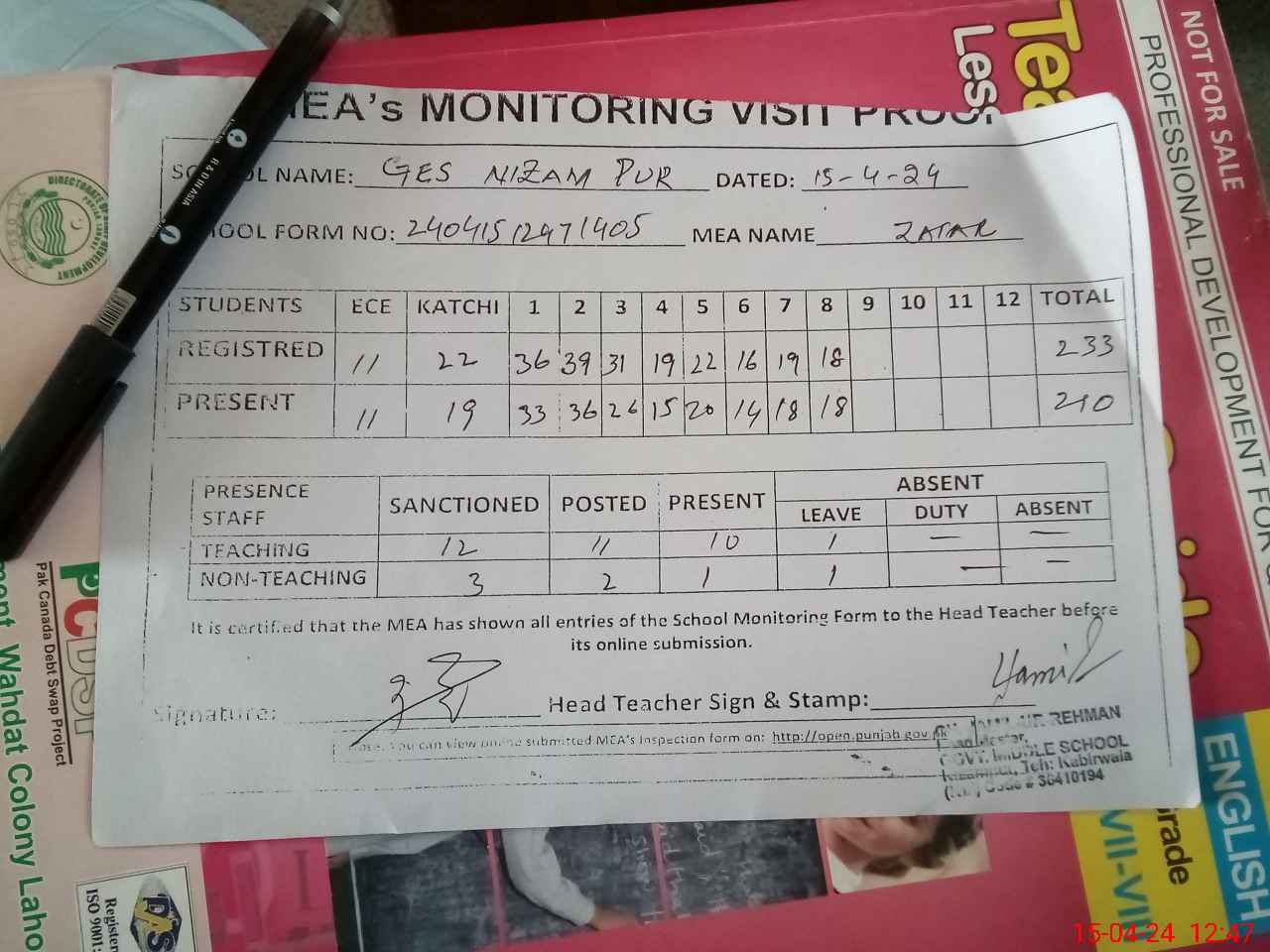| Attendance Register | Head Teacher | MEA with School | Visit Proof |