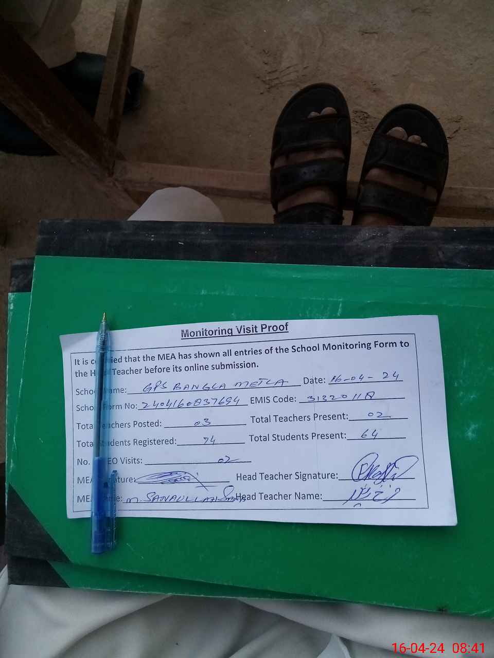 | Attendance Register | Head Teacher | MEA with School | Visit Proof |