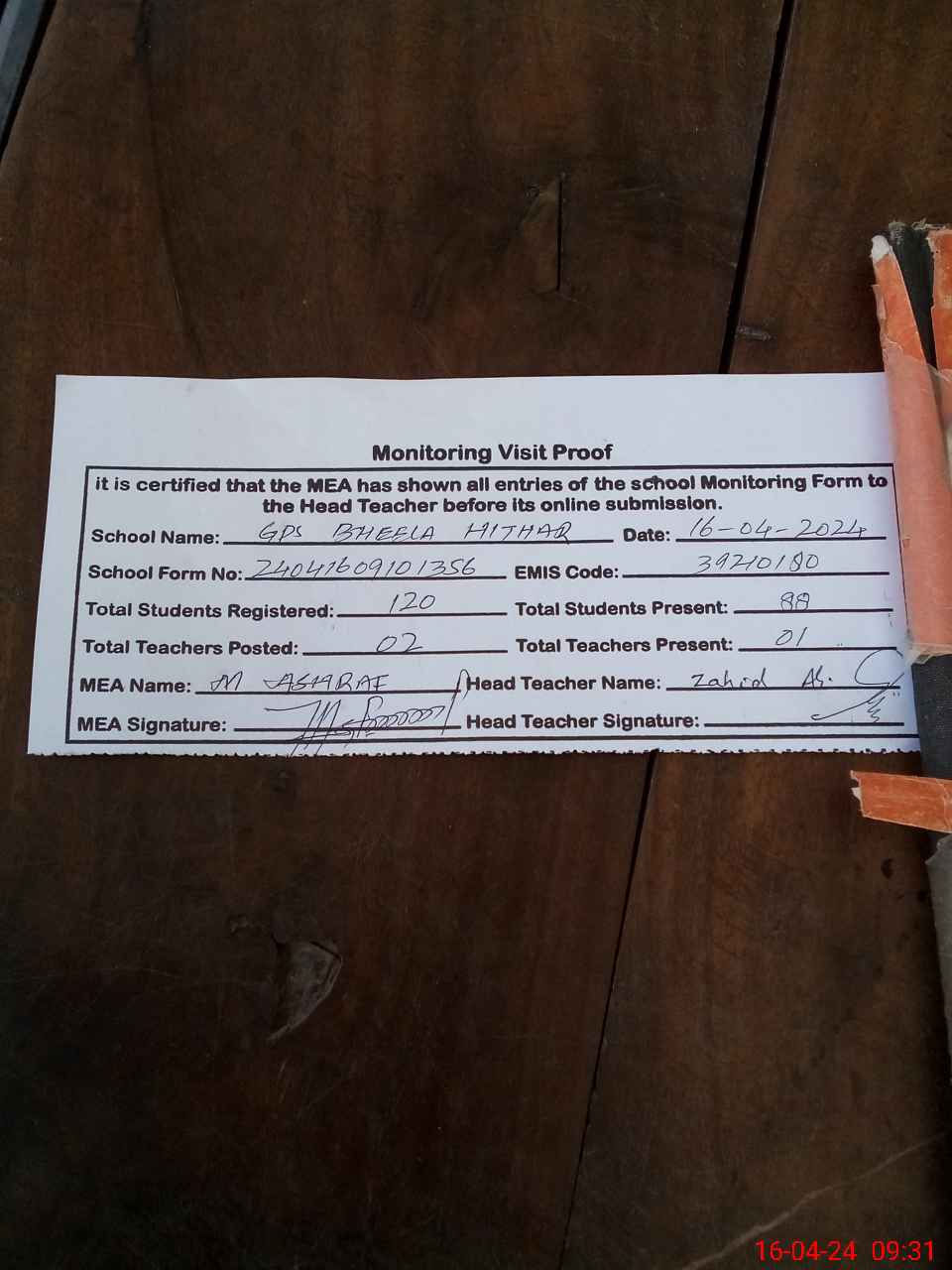 | Attendance Register | Head Teacher | MEA with School | Visit Proof |