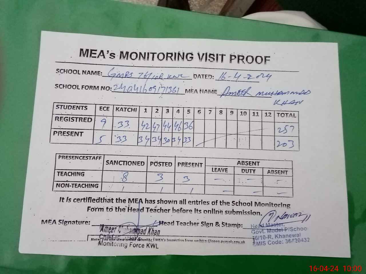 | EMIS Code: 36420432 | Name of School: GMPS 76/10-R, KHANEWAL | |||