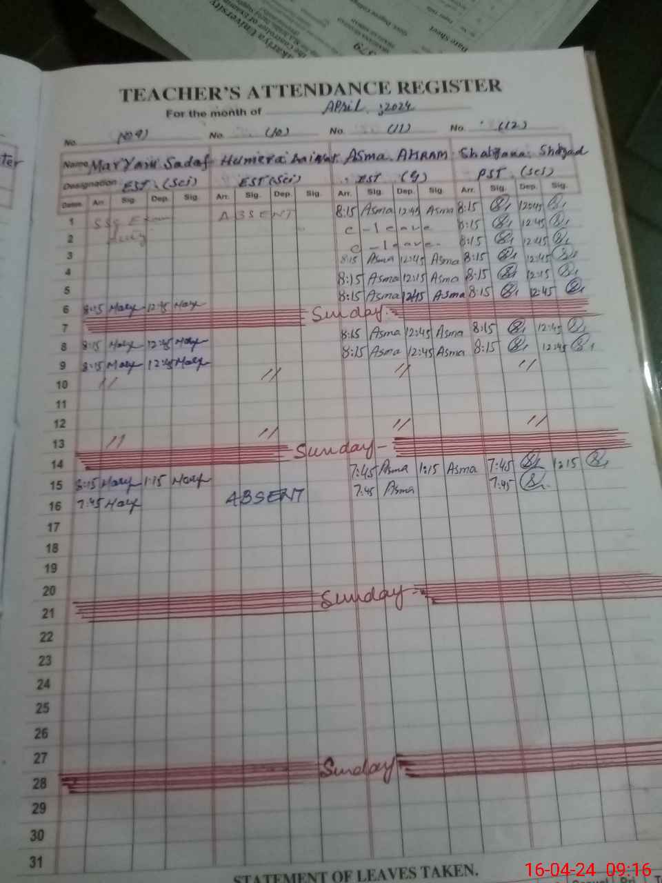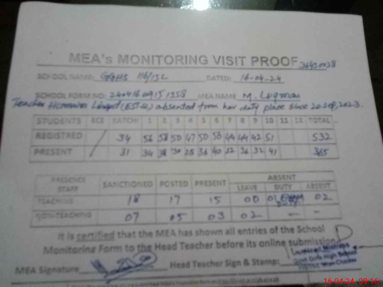 | Remarks (Use Separate Page if Required): Teacher Humaira Liaqat EST Sc absentee from duty place since 20 September 2023 | |||||