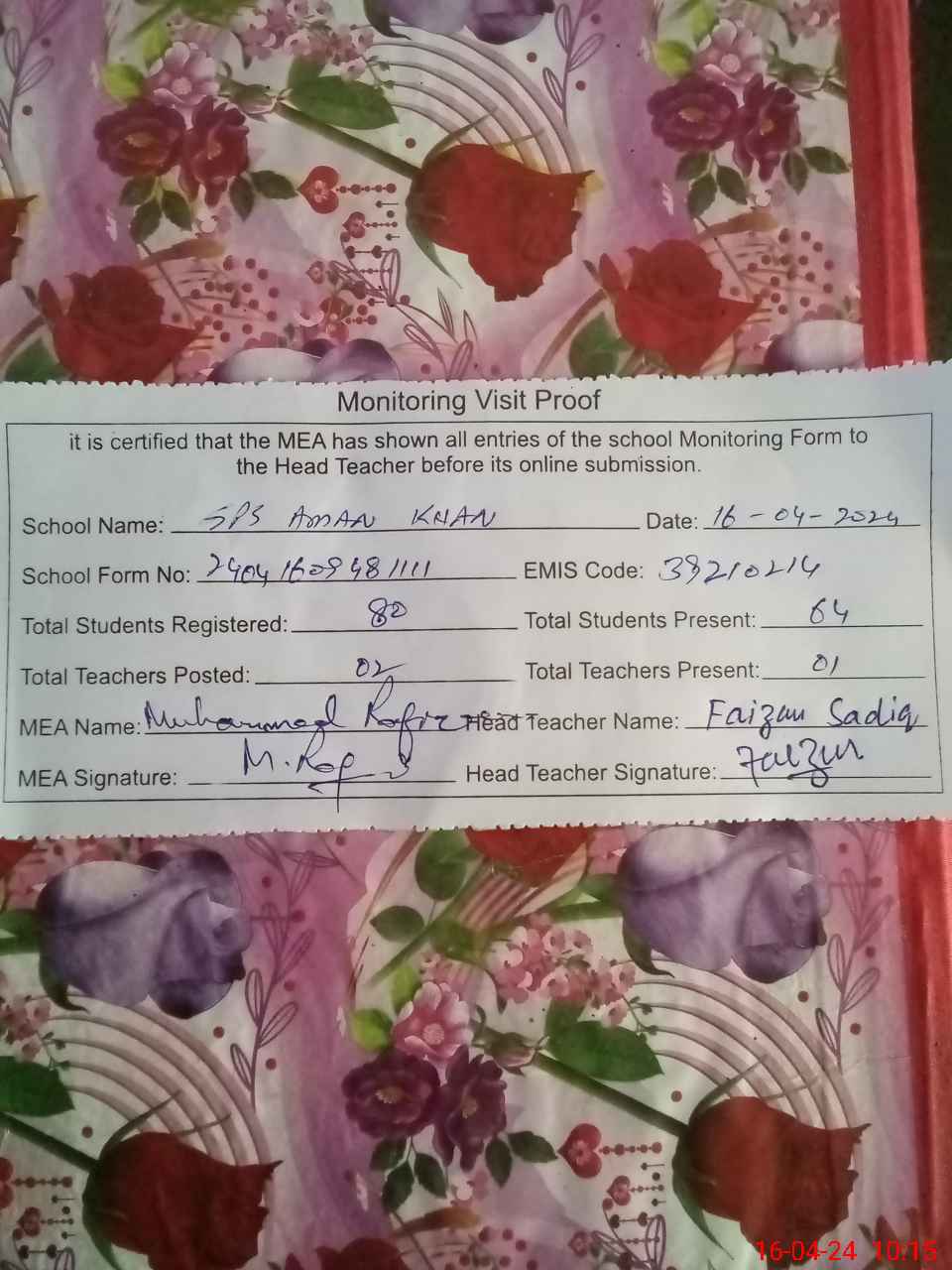 | Attendance Register | Head Teacher | MEA with School | Visit Proof |