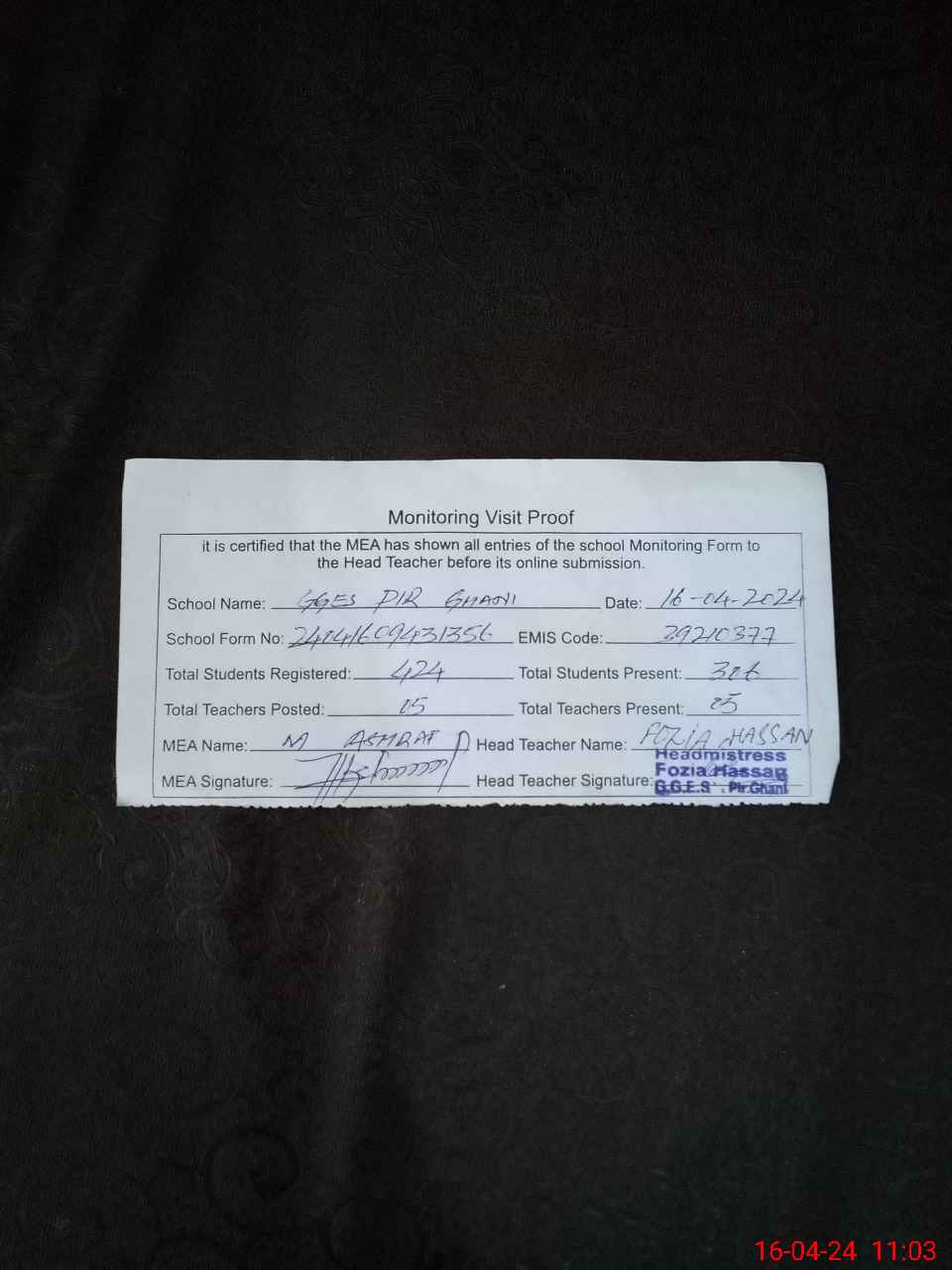 | Name: Fo**** Ha**** Designation: (School Headmaster's/Headmistress's) SST Phone/Cell Number: 03**** |
