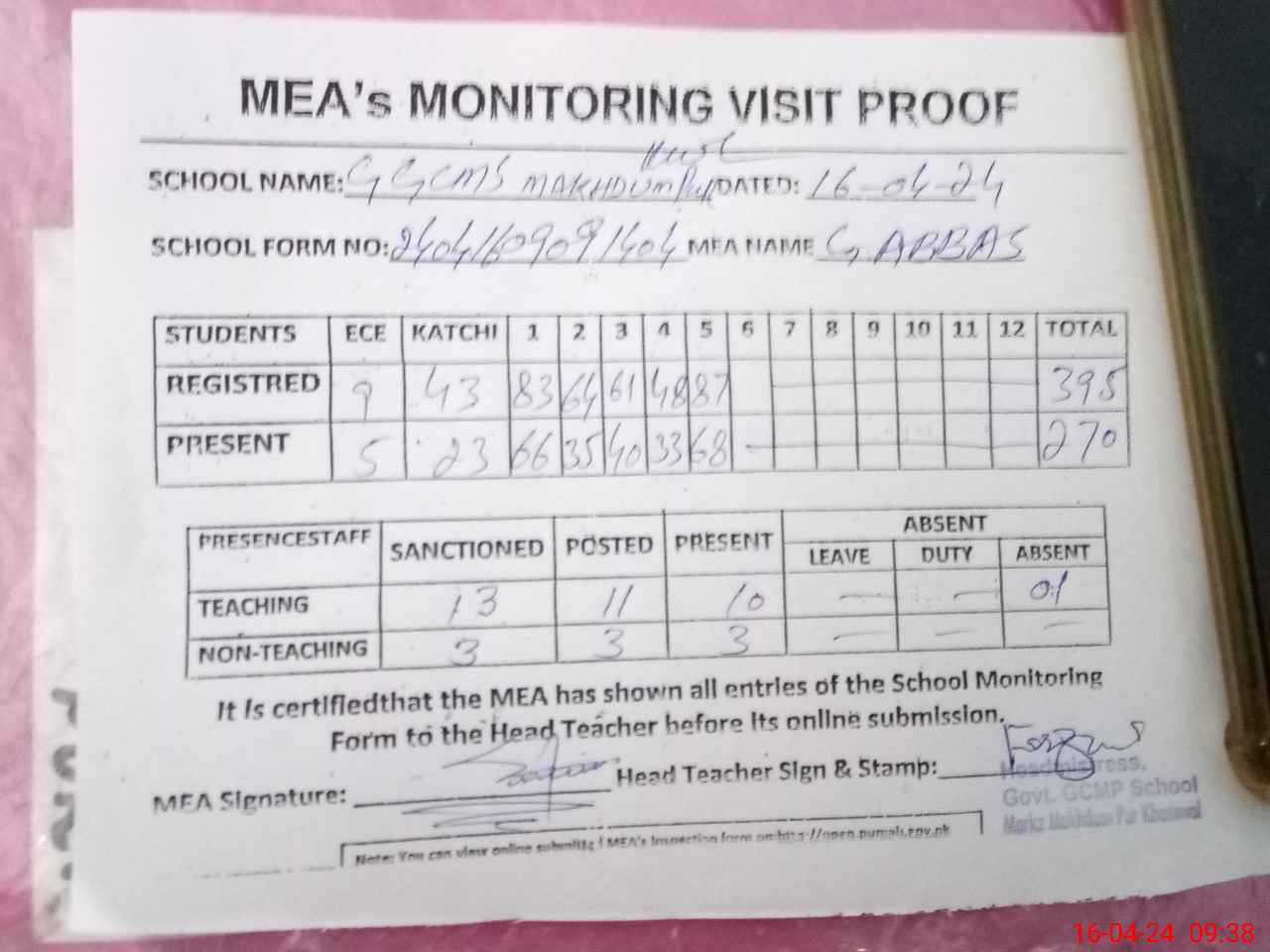 | Attendance Register | Head Teacher | MEA with School | Visit Proof |