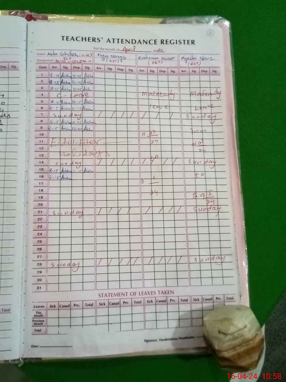 | 36**** | Ay**** Na**** | Regular | 31 | 0 | 0 | 31 | 0 | 0 | 0 | 0 | 0 | Maternity | |