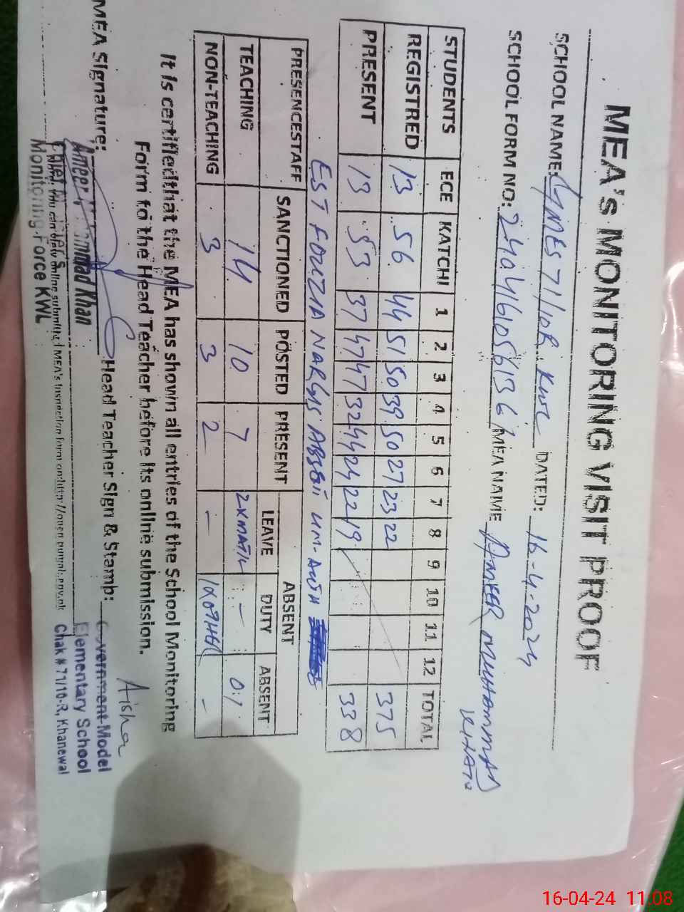 | Attendance Register | Head Teacher | MEA with School | Visit Proof |