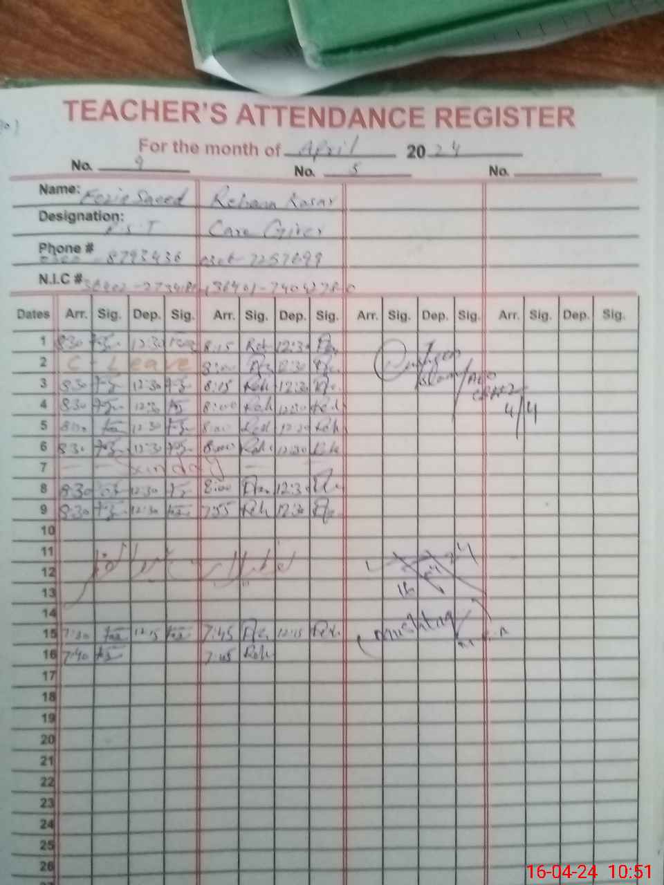 | CNIC | Full Name | Designation | R/C | Absence During Last Calender Month |