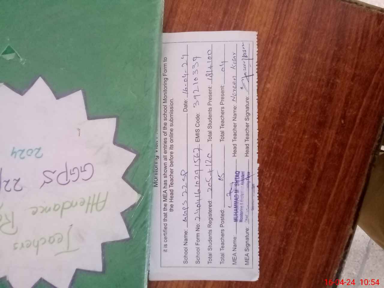 | Attendance Register | Head Teacher | MEA with School | Visit Proof |