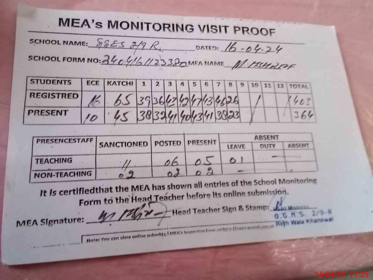 | Attendance Register | Head Teacher | MEA with School | Visit Proof |
