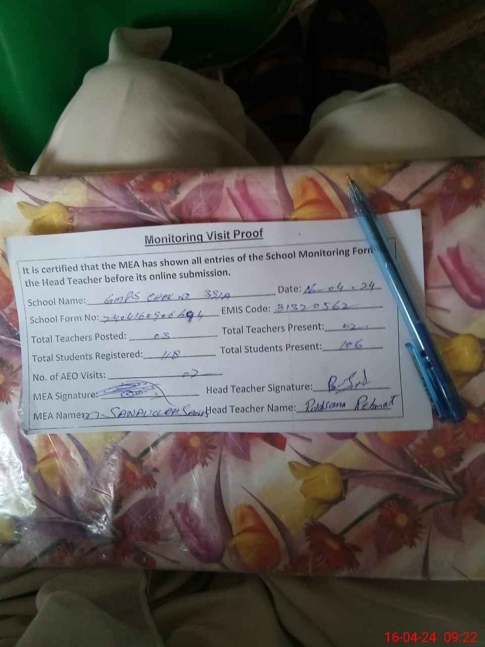 | Monitoring Date: 16-04-2024 | Start Time: 16-04-2024 09:06 AM | End Time: 16-04-2024 09:23 AM | Name of MEA: Mu**** Sa**** Ul**** Sa**** | |