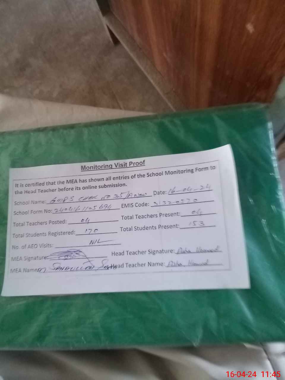 | EMIS Code: 31320570 | Name of School: GMPS CHAK 35/A NEW | |||