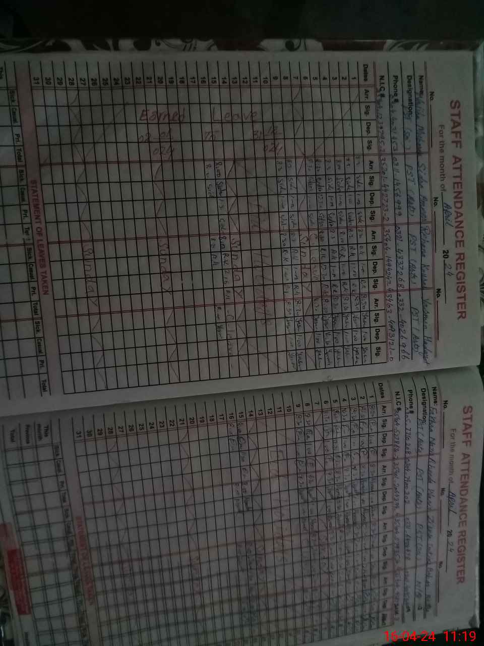 | CNIC | Full Name | Designation | R/C | Absence During Last Calender Month |