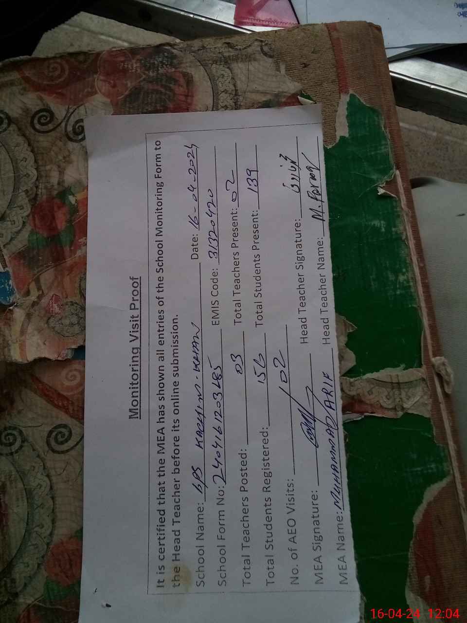 | Attendance Register | Head Teacher | MEA with School | Visit Proof |