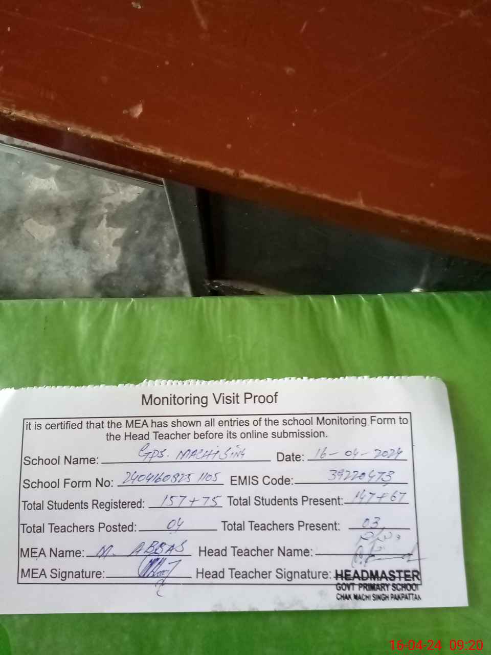 | Attendance Register | Head Teacher | MEA with School | Visit Proof |