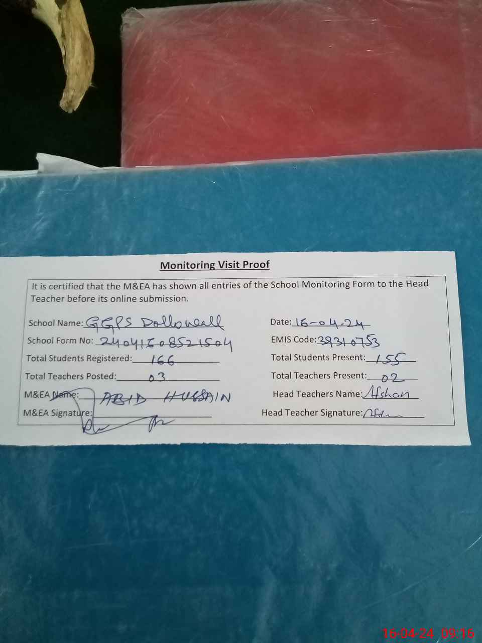 | Attendance Register | Head Teacher | MEA with School | Visit Proof |
