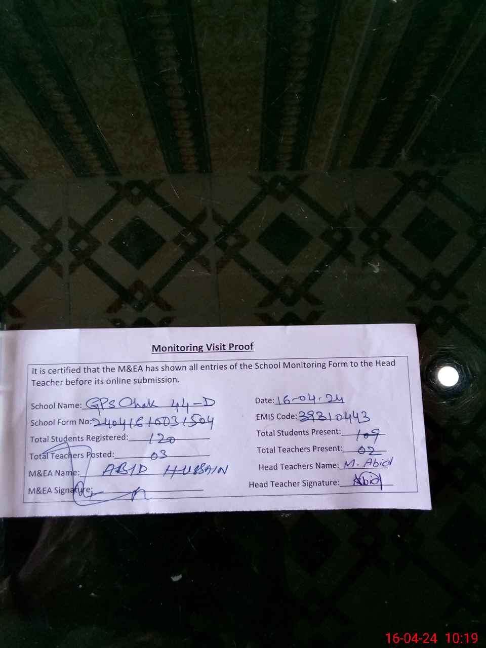 | EMIS Code: 39310443 | Name of School: GPS CHAK NO.44-D | |||