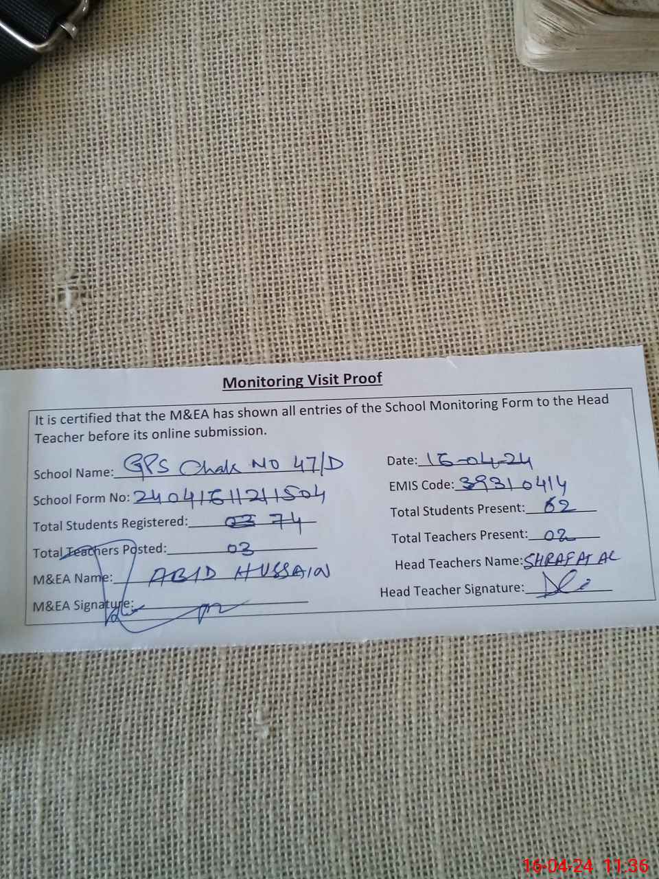 | Attendance Register | Head Teacher | MEA with School | Visit Proof |