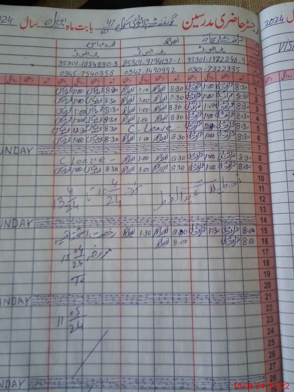 | CNIC | Full Name | Designation | R/C | Absence During Last Calender Month |