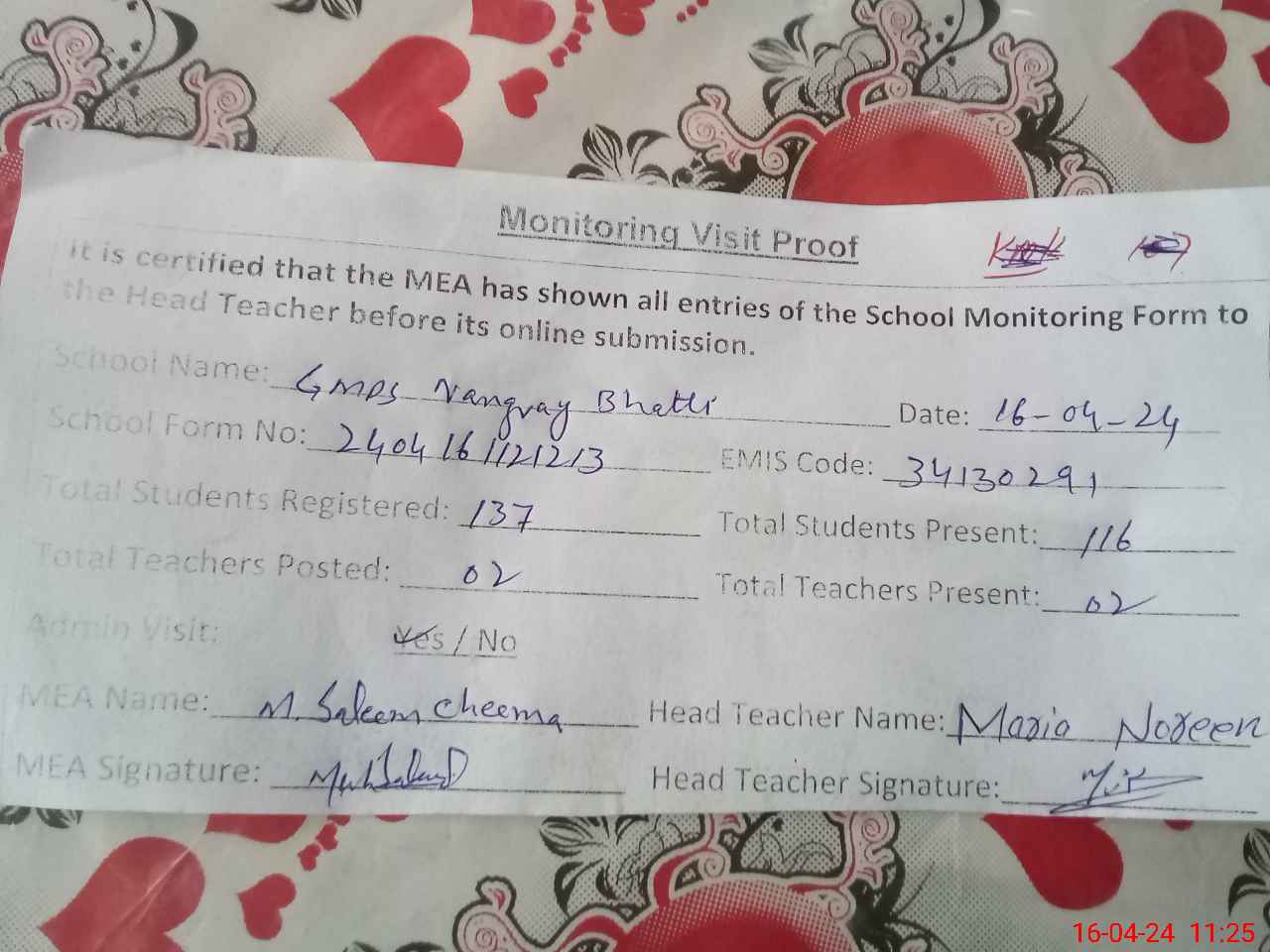 | Certified that this School was Inspected by the Undersigned MEA/DMO Today and the Information Stated Above is as Per Record. | |||||