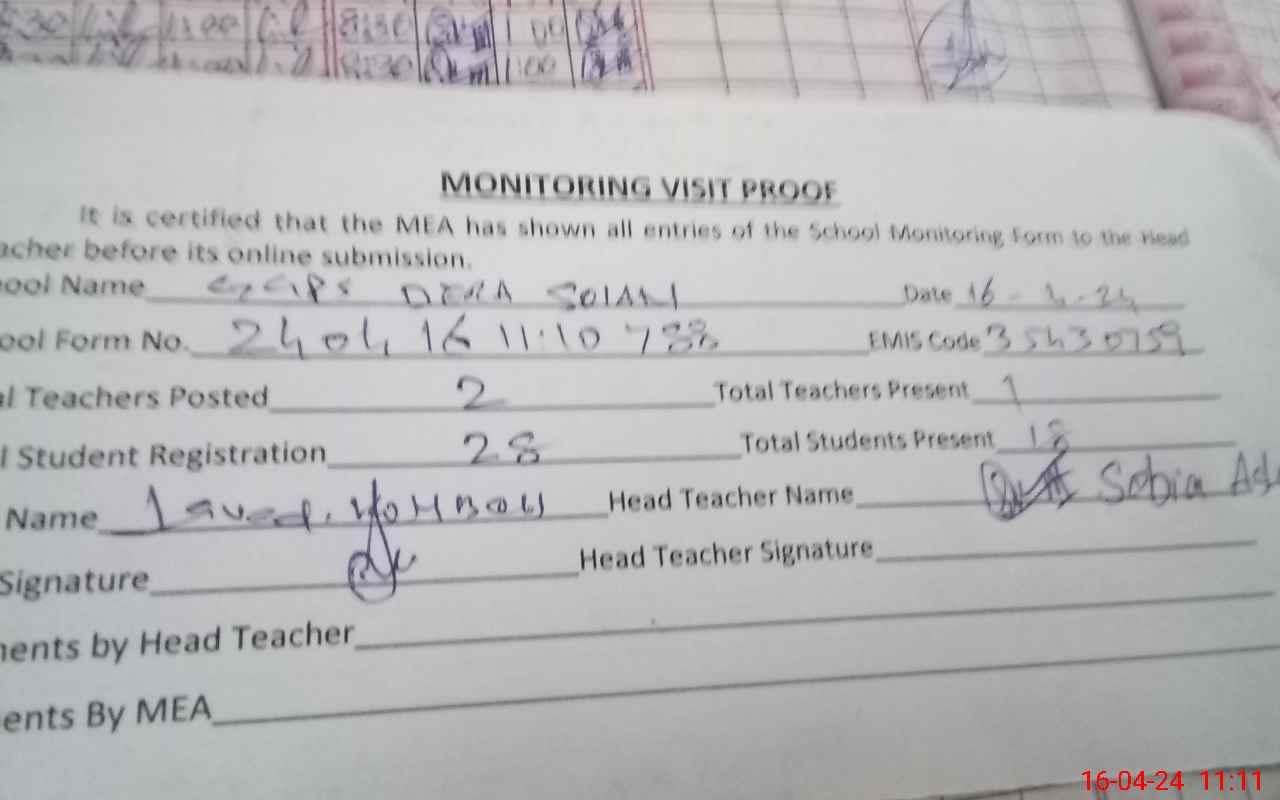 | Name: SO**** AS**** Designation: (School Headmaster's/Headmistress's) PST Sci-math Phone/Cell Number: 03**** |