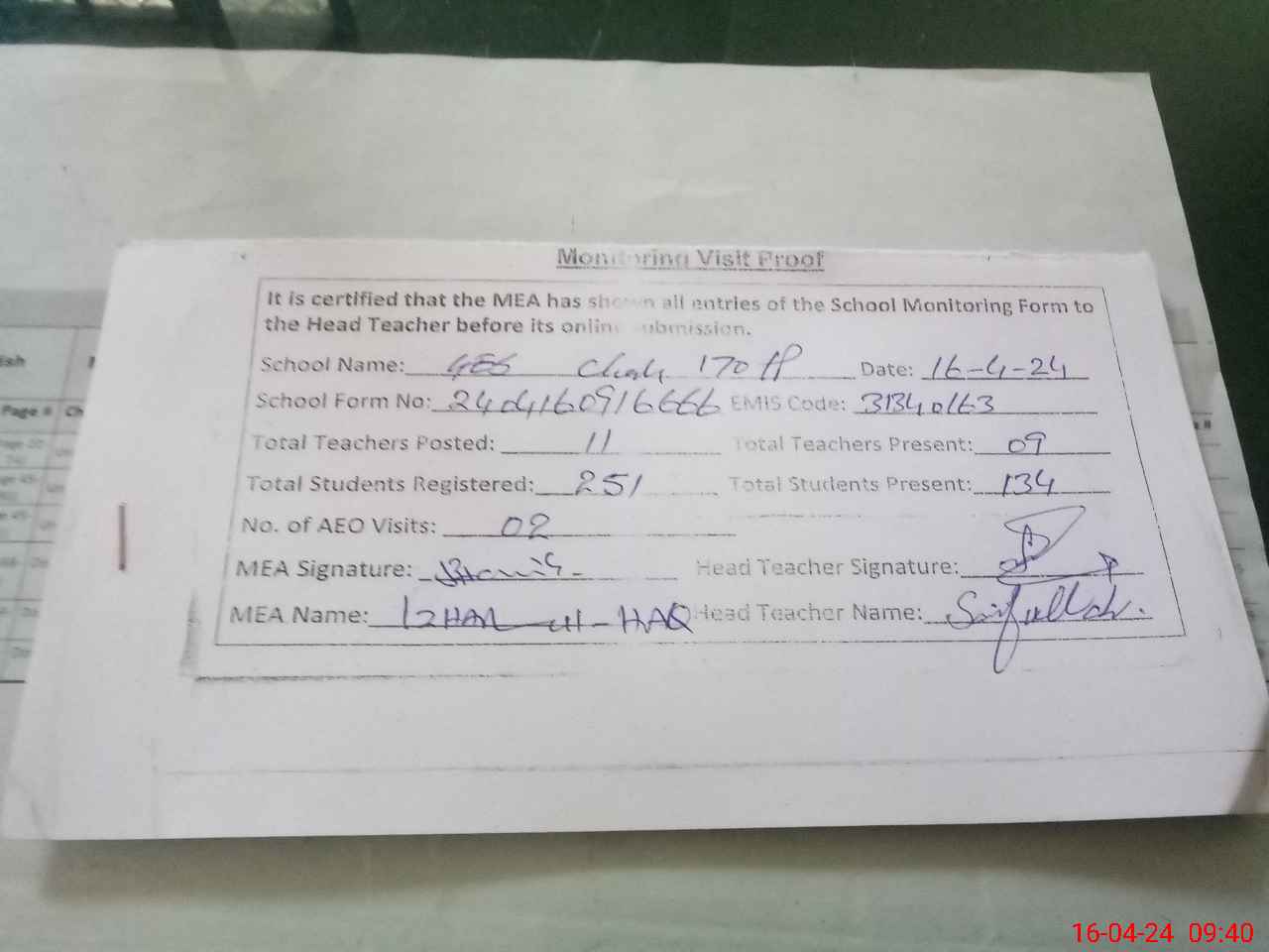 | EMIS Code: 31340163 | Name of School: GES CHAK NO 170/P | |||