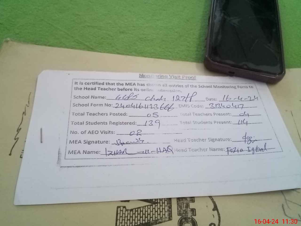 | Attendance Register | Head Teacher | MEA with School | Visit Proof |