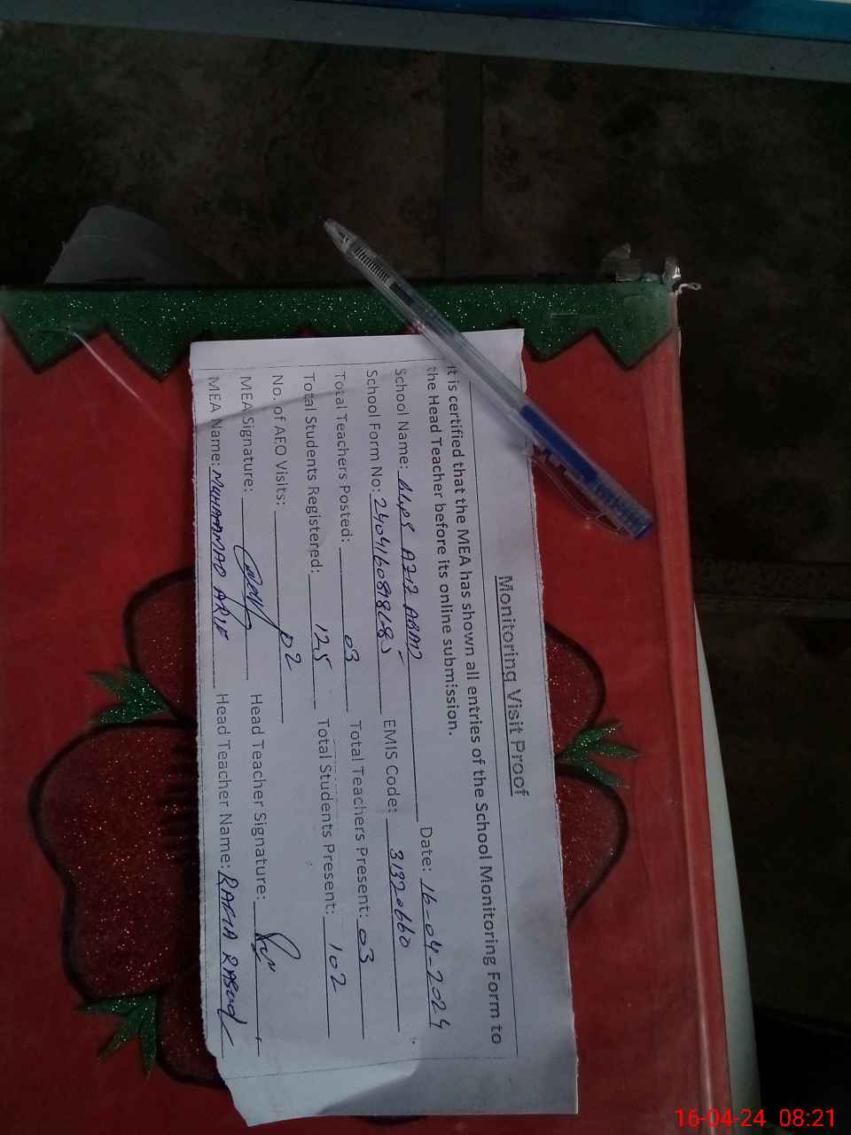 | Attendance Register | Head Teacher | MEA with School | Visit Proof |