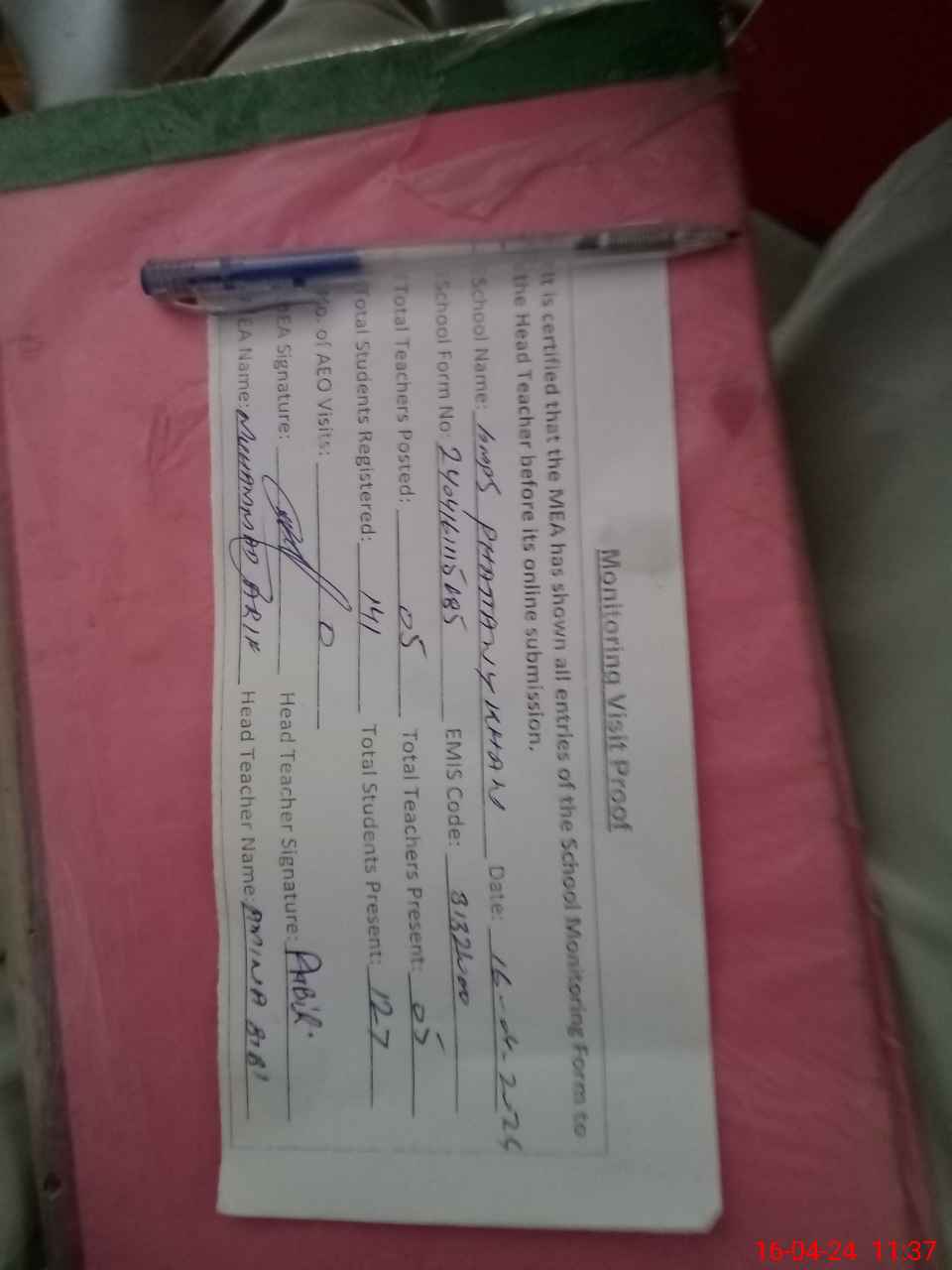 | Attendance Register | Head Teacher | MEA with School | Visit Proof |