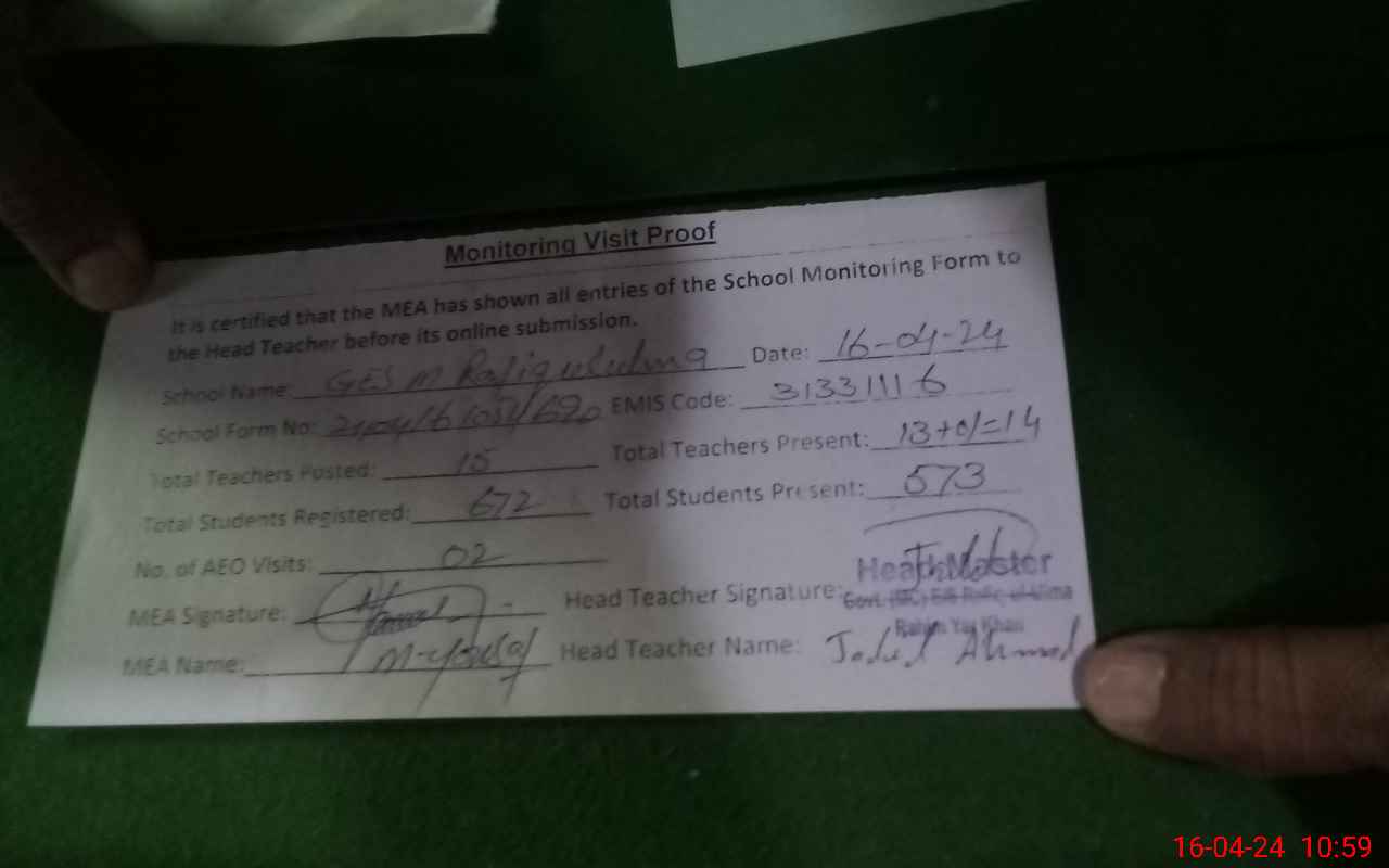 | EMIS Code: 31331116 | Name of School: GES MC RAFIQ-UL-ULMA | |||