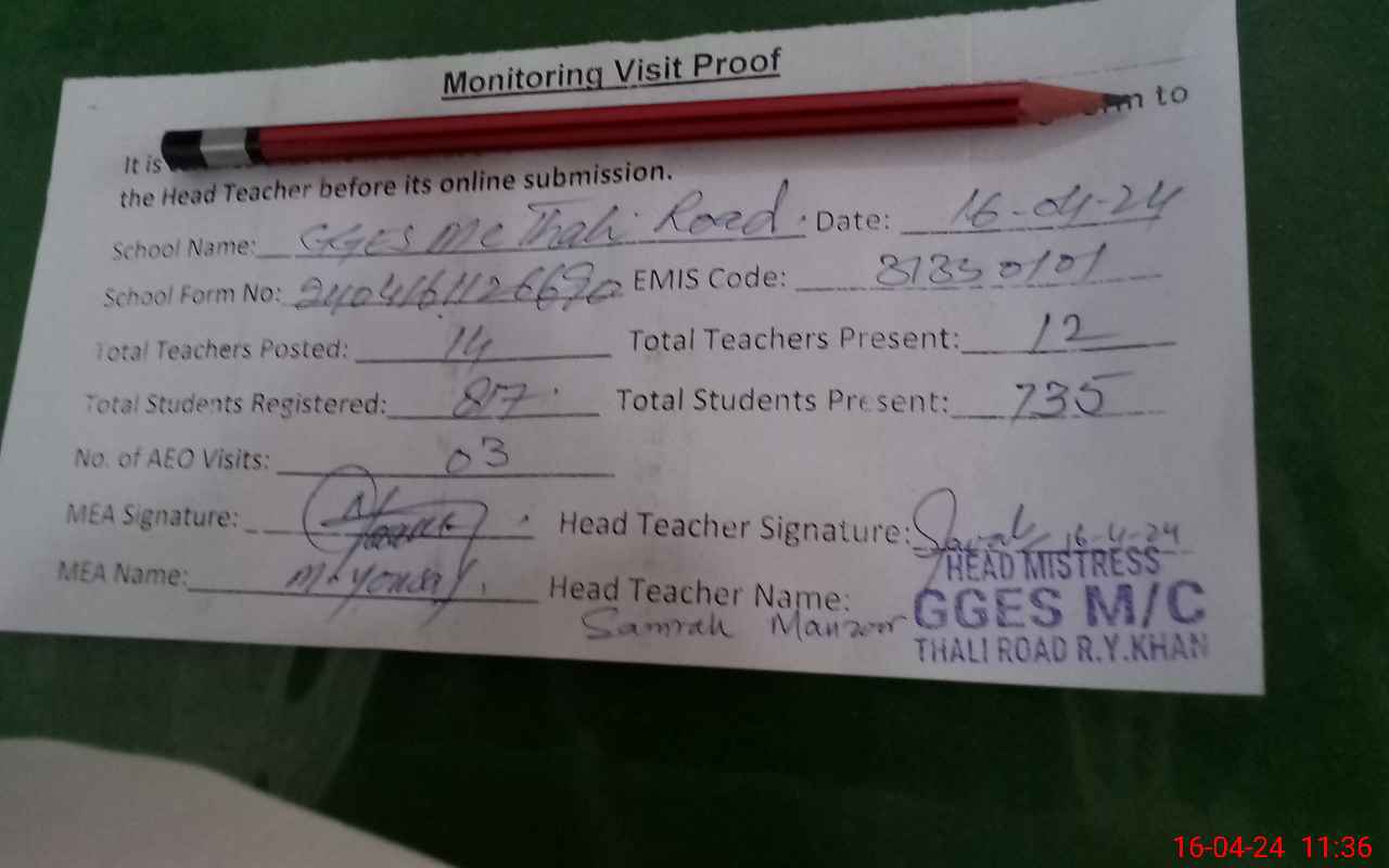 | Attendance Register | Head Teacher | MEA with School | Visit Proof |