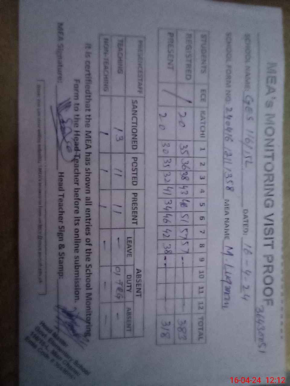 | Attendance Register | Head Teacher | MEA with School | Visit Proof |