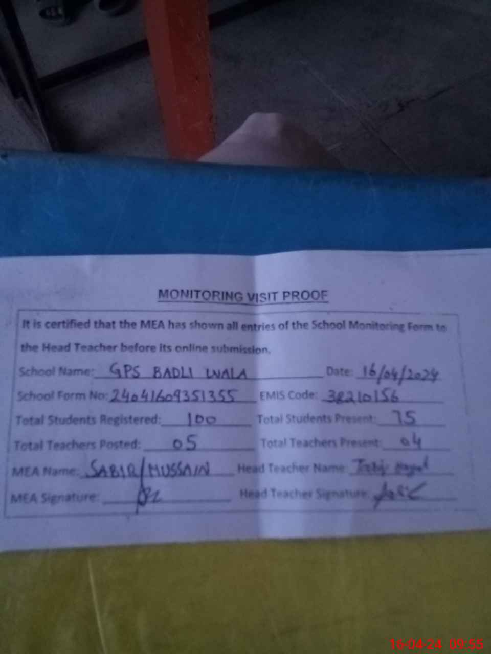 | Attendance Register | Head Teacher | MEA with School | Visit Proof |